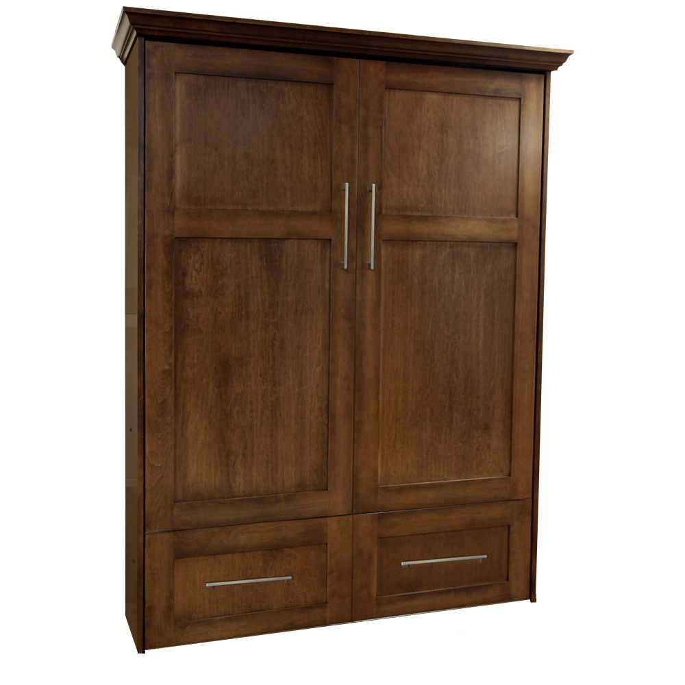 Muti-panel faux doors adorn the decorative face of this Georgetown murphy bed. Brushed chrome hardware adds the perfect decorative element to accentuate this piece. Regardless of your living situation, make the most of your multi-use space with this versatile murphy bed. Its convertible design lets you transform any room in your home into a guest room at a moment’s notice. The vertical orientation sleeps exactly like a typical bed, and allows for a 12″ thick inner spring mattress.